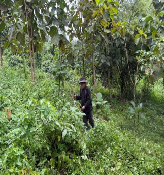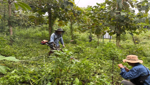 การกำจัดวัชพืชในพื้นที่แปลงปลูก ซึ่งมีสภาพชัน และมีการปลูกตามแนวเส้นชันระดับความสูง ในการกำจัดวัชพืชจำเป็นต้องใช้แรงงานคนและเครื่องตัดหญ้า ดำเนินการกำจัดวัชพืชตามร่องปลูก โดยมีการเจาะช่องปลูกและกำจัดวัชพืชรอบโคนต้นไม้ตามแนวปลูก