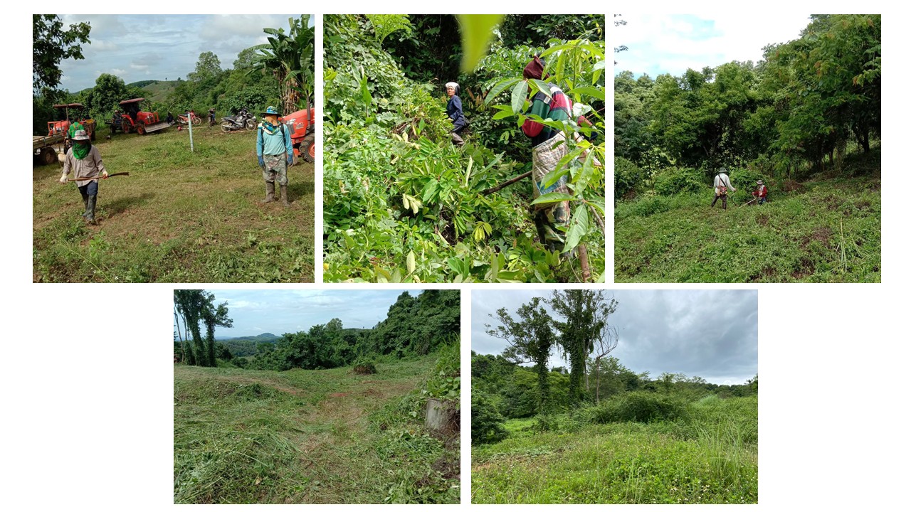 การกำจัดวัชพืชในพื้นที่แปลงปลูก ซึ่งมีสภาพชัน และมีการปลูกตามแนวเส้นชันระดับความสูง ในการกำจัดวัชพืชจำเป็นต้องใช้แรงงานคนและเครื่องตัดหญ้า ดำเนินการกำจัดวัชพืชตามร่องปลูก โดยมีการเจาะช่องปลูกและกำจัดวัชพืชรอบโคนต้นไม้ตามแนวปลูก