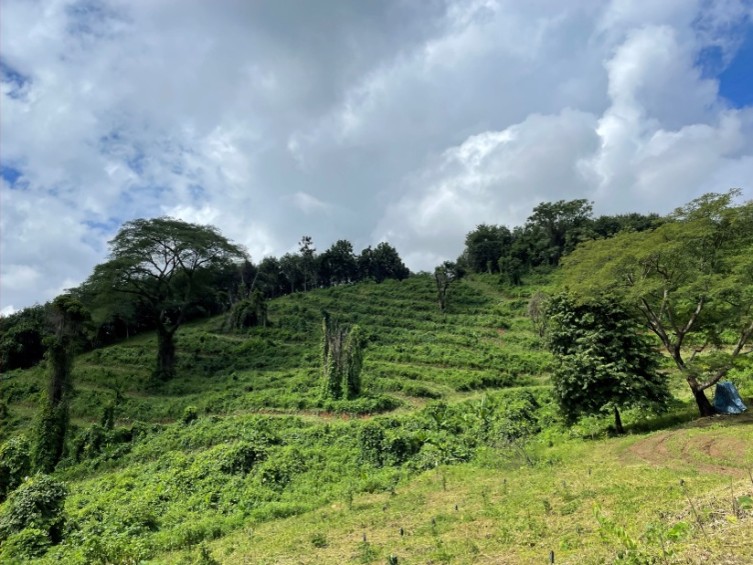 แปลงที่ 2 : ต้นไม้มีอัตราการรอดตายอยู่ที่ 90% ต้นไม้มีความสูงเฉลี่ยอยู่ที่ 155-175 เซนติเมตร ขนาดเส้นรอบวงของต้นไม้เฉลี่ย 17- 30 เซนติเมตร ต้นไม้ที่เติบโตได้ดี ได้แก่ สัก มะขามป้อม พะยูง และยางนา ชุมชนมีการกำจัดวัชพืชในพื้นที่แปลงปลูก ซึ่งมีสภาพพื้นที่ชัน และมีการปลูกต้นไม้ตามแนวเส้นชันตามระดับความสูง วิธีดำเนินการกำจัดวัชพืชตามร่องปลูก มีการเจาะช่องปลูกและกำจัดวัชพืชรอบโคนต้นไม้ตามแนวปลูก ในเดือนพฤษภาคม - กันยายน 2568 ในบริเวณพื้นที่ปลูกมีอ่างเก็บน้ำขนาดใหญ่ จึงทำให้มีปริมาณน้ำเพียงพอในช่วงฤดูแล้ง และจะปลูกซ่อมแซมต้นไม้ที่ตายในช่วงฤดูฝนปีถัดไป