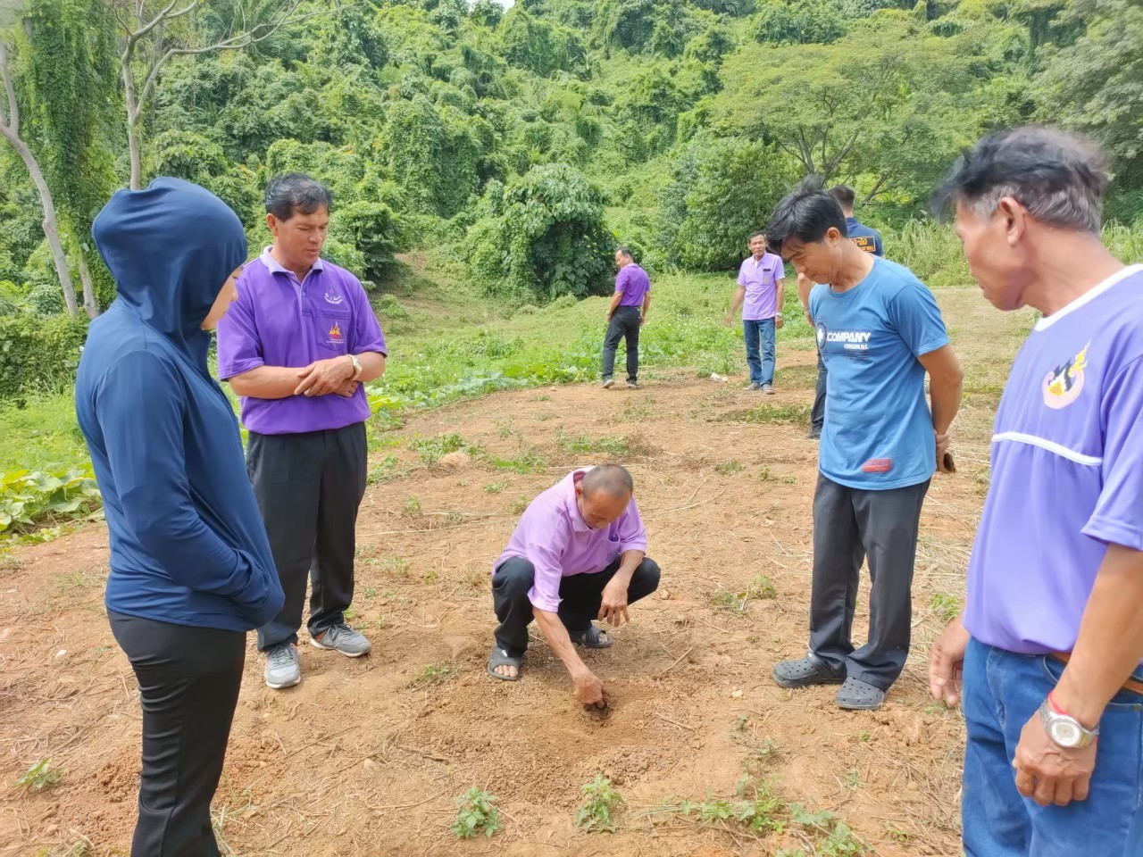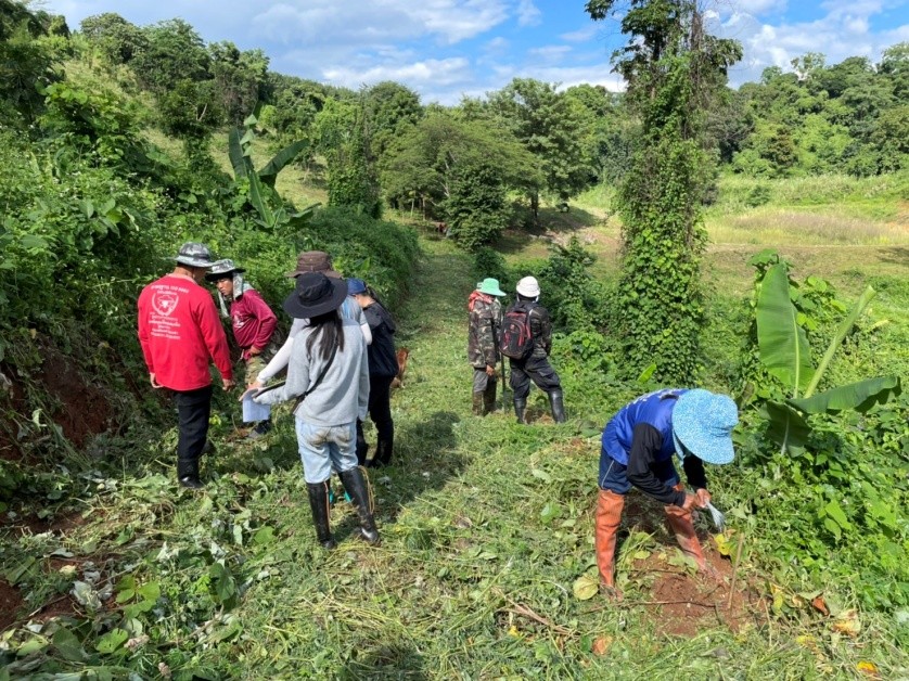 สมาชิกชุมชนบ้านใหม่ ดำเนินการล้างท้องป่า เพื่อเตรียมหน้าดินสำหรับการปลูกต้นไม้ โดยกำจัดวัชพืชบริเวณแปลงปลูกพื้นที่ 10 ไร่