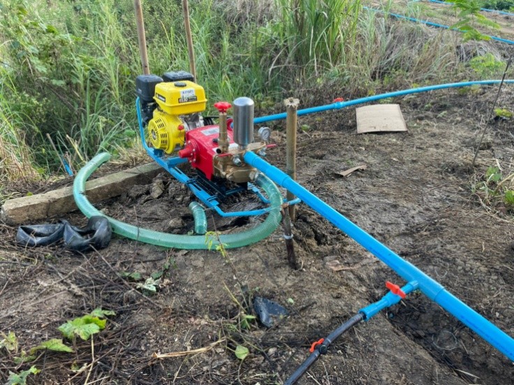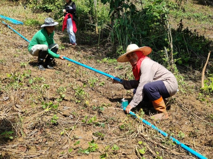 วางระบบน้ำหยดเป็นแถว รวมทั้งหมด 20 แถว โดยแต่ละแถวจะมีระยะห่าง 2x4 เมตร และสูบน้ำจากอ่างเก็บน้ำไปยังถังเก็บน้ำ ขนาด 1,000 ลิตร