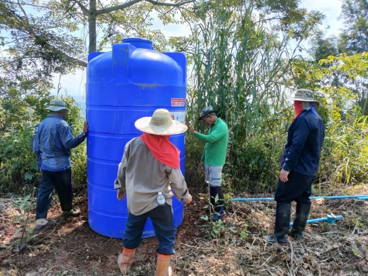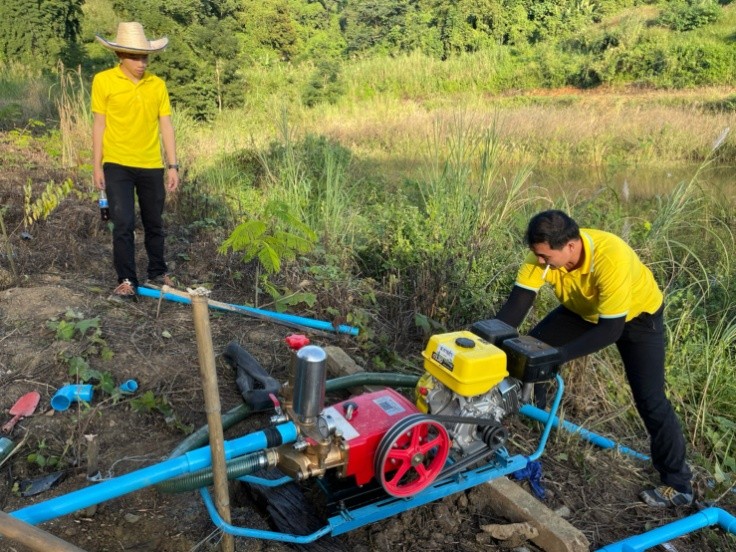 วางแผนระบบหยดที่สูบน้ำจากสระน้ำเพื่อการเกษตรขึ้นไปพักบนถังน้ำจุดสูงสุด และปล่อยผ่านสายยางไปยังต้นไม้ทุกต้น ในระยะเวลาที่ฝนทิ้งช่วง