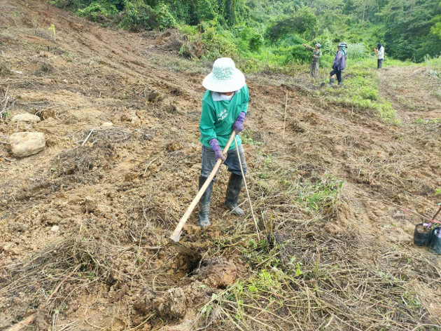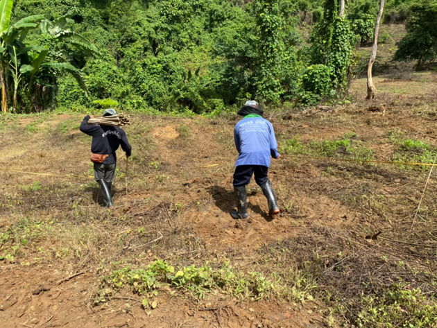ขุดหน้าดินปักแนวหลักสะเต็กไม้ไผ่ยาว 80 เซนติเมตร เพื่อปลูกต้นไม้ตามแนวปักหลัก