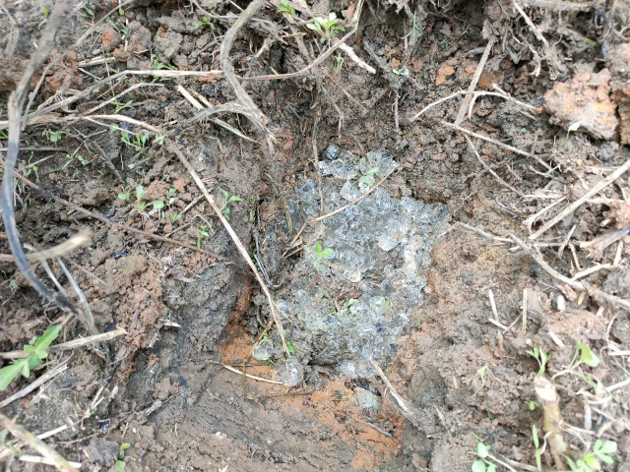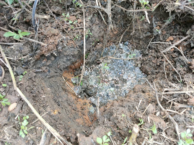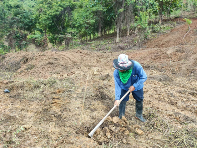 ขุดหลุมตามเส้นแนวหลักสะเต็กไม้ไผ่ สำหรับการใส่ปุ๋ยรองพื้นและพอลิเมอร์