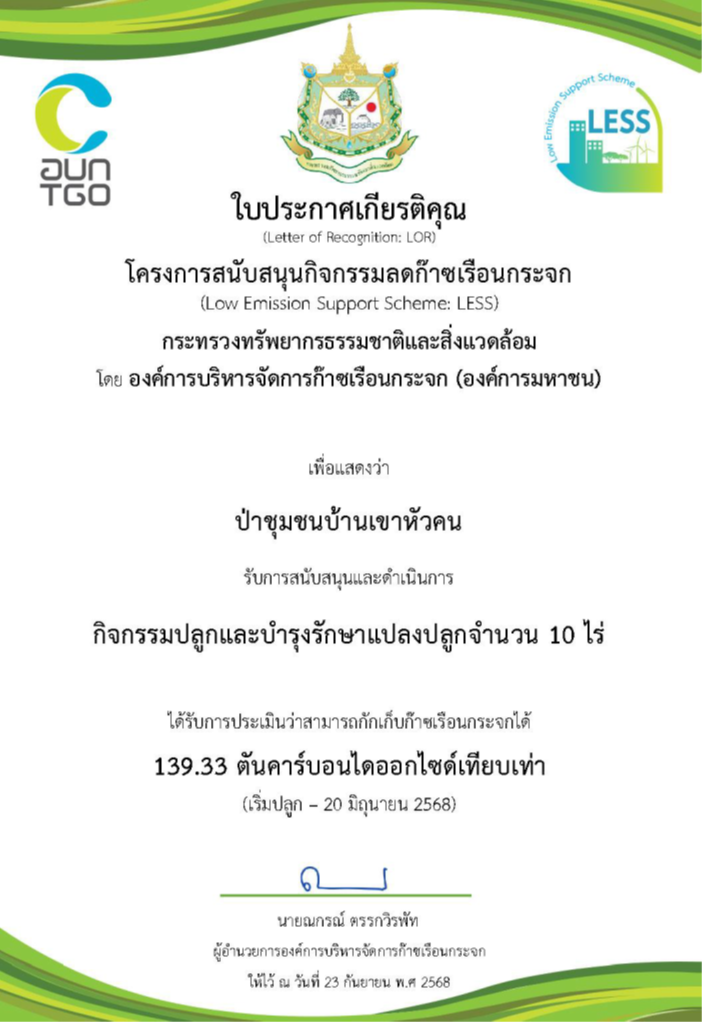 เมื่อวันที่ 18 มิถุนายน 2568 ทีมงาน Care the Wild กรมป่าไม้ และผู้แทนจาก ธ.กรุงศรีอยุธยา ผู้สนับสนุนการปลูกต้นไม้บนพื้นที่ป่าชุมชนบ้านเขาหัวคน จ.ราชบุรี แห่งนี้ ได้ลงพื้นที่ เพื่อติดตามผลปลูกและดำเนินกระบวนการวัดความเติบโตของต้นไม้ เพื่อยื่นเอกสารขอการรับรองจากโครงการสนับสนุนกิจกรรมลดก๊าซเรือนกระจก (Low Emission Support Scheme) หรือเรียกว่าโครงการ LESS จากองค์การบริหารจัดการก๊าซเรือนกระจก (องค์การมหาชน) ซึ่งมีแนวคิดในการพัฒนารูปแบบการดำเนินกิจกรรมลดก๊าซเรือนกระจกเพื่อสร้างความตระหนักให้เกิดการลดการปล่อยก๊าซเรือนกระจก และยกย่องผู้ทำความดีโดยการมอบใบประกาศเกียรติคุณ (Letter of Recognition: LOR)